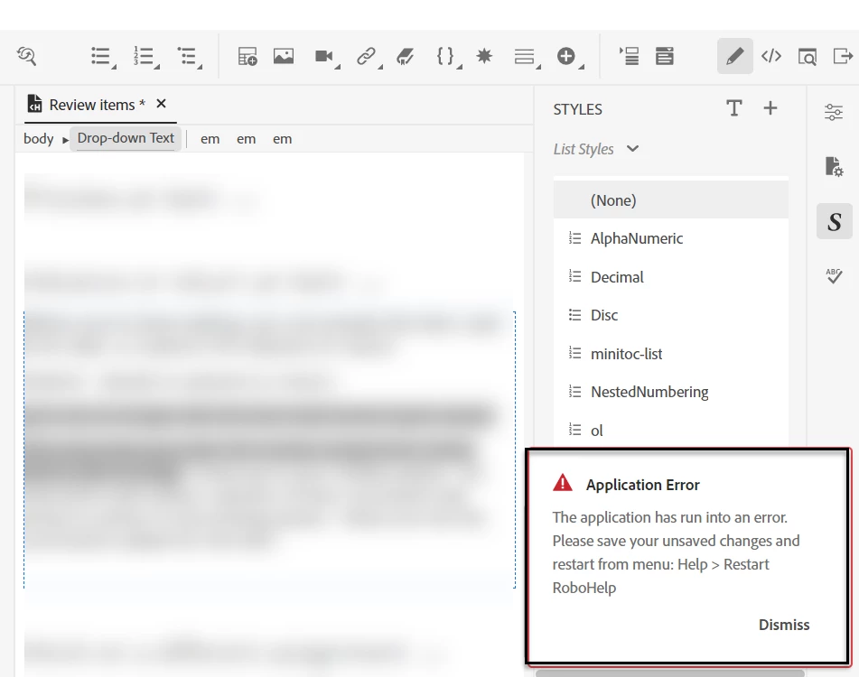 I'm suddenly unable to apply styles using the Styles pane in RH 2020. When I select text and click on a style, it throws an error telling me to restart RoboHelp. I've tried this, along with signing out and back in to my account and still not working. Any ideas on how to fix this or is anyone else experiencing this?