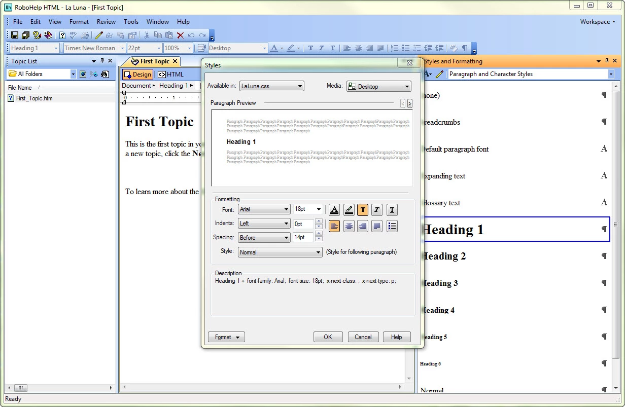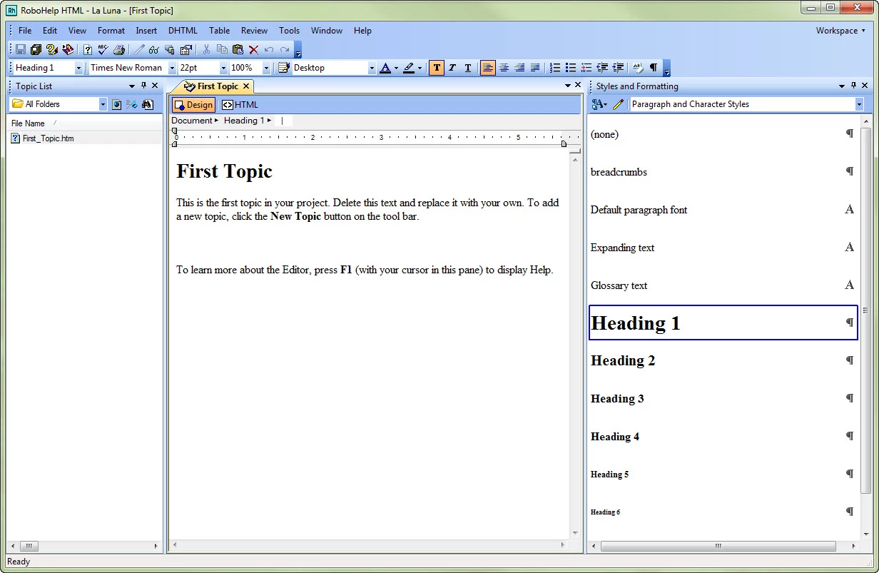 After many years of working in RoboHelp and carrying on with inline styles, I'm now looking into changing over to style sheets. I've been tinkering with them in some test projects, and I'm having the same problem that Pam did. The process of creating and applying a style sheet is simple, as far as I can tell, yet I can't get the style sheet formatting to appear. It's in the HTML--I see the .css specified, and there are only heading tags and so on present instead of inline stuff--yet the fonts I've selected appear neither in the Styles and Formatting pod nor in the Design view of the topic. I searched Adobe for help and found this: ROBOHELP 10: Creating CSS for a Topic | Tech Comm Suite Highlights | Adobe TV. I did exactly the same steps, but my fonts and spacing do not change as they do in the video. They don't appear different, that is. When I go into the style sheet, my selections are in there; they're just not displayed on the screen. I compiled a chm file to see if by chance the changes might appear there, but no.