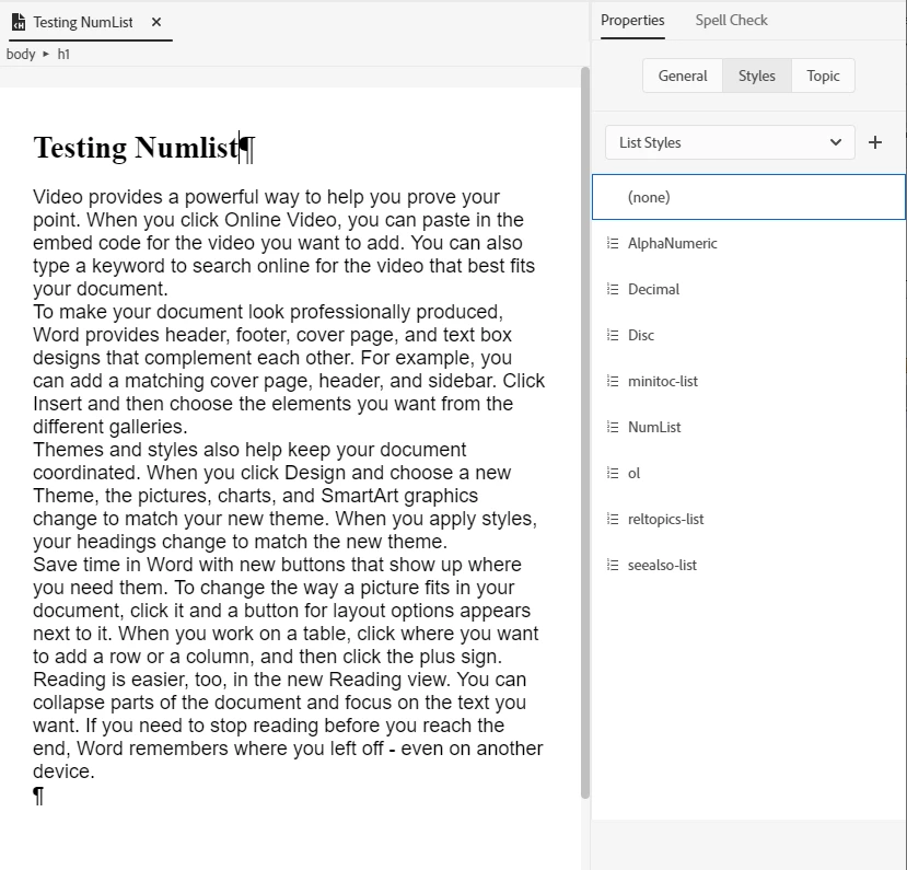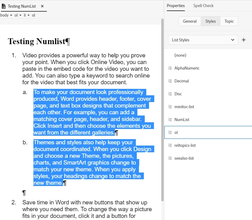 This first screenshot is the desired outcome. This is the document in Word that we imported into RH. The highlighted text is where the problem is (one area I'm haivng the problem, althought it's happening in most all of the files we are importing. ) I'm needing to change the existing bullets to lower-alpha numbers. I cleaer the formatting on the existing lines and then apply my NumList style that I created in RH. Level 1 looks great, but when I press tab, nothing happens.