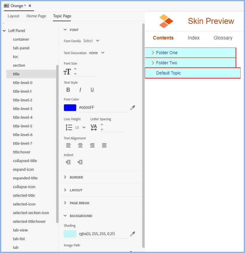 I just set up the title in these colours and then went to Selected Topic and changed the text to lime green. When I generated the output all the topics show as below except the selected topic when the font changes to lime green.