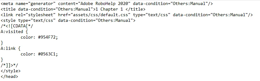 In two or three topics in Robohelp, switch to code view and look for that code and delete it. You might find it appears in the topic as <body link="xxxxx" vlink="xxxx"> - just delete the link and vlink text, rather than the whole tag.