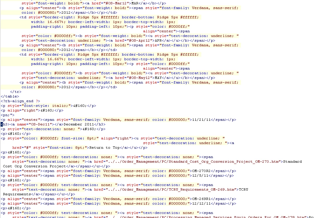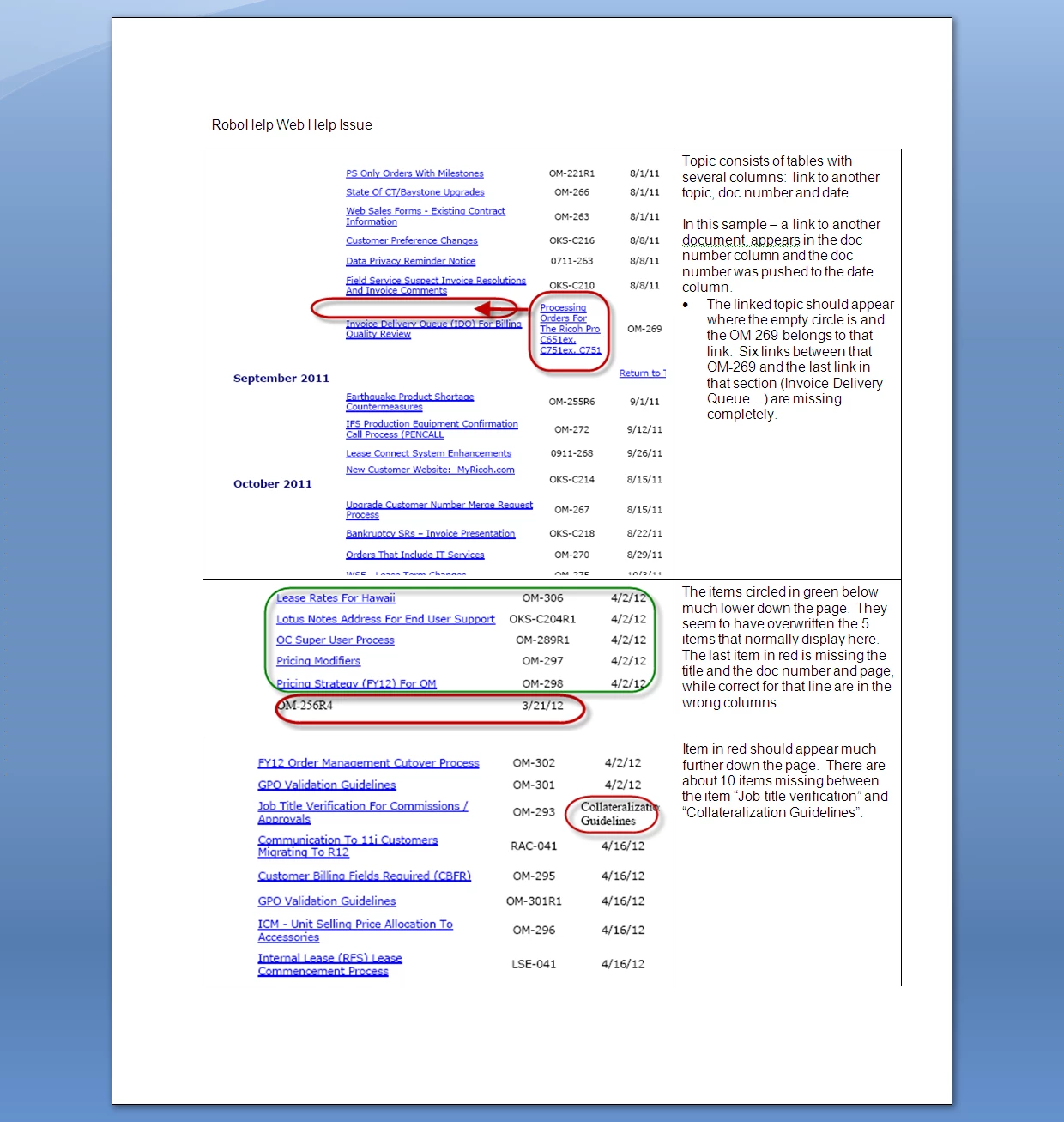 My team has encountered issues with tables getting all jumbled up and we're hoping someone can tell us what's going on and provide some suggestions of how to troubleshoot.  This has occured on  multiple computers, publishing different projects, publishing to different servers. It appears after generating.  In each project, we provide several topics that are lists of links to various topics. The information is presented in a table with a column for title, a column for doc number and a table for date.  At random times, seemingly after we add or update links, the table rows and columns get messed up.  A linked title suddenly appears in the doc number column for another document and several rows of links just disappear.  We've tried deleting the CPD and reimporting a "clean" htm file from a previous backup but when we do that, the links come in all broken - this seems to happen on these pages only as other imported htm files with links come in just fine.  I've attached a screen shot showing various examples.  Any suggestions would be greatly appreciated.