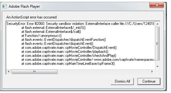 @shinjineec39545708  - This could simply be an issue where Flash tosses an error because you are running it from your local hard drive. Presumably while testing and before you make the content available to others. If that's the case, things *SHOULD* be fine once you deploy the content and others consume it from a web server.