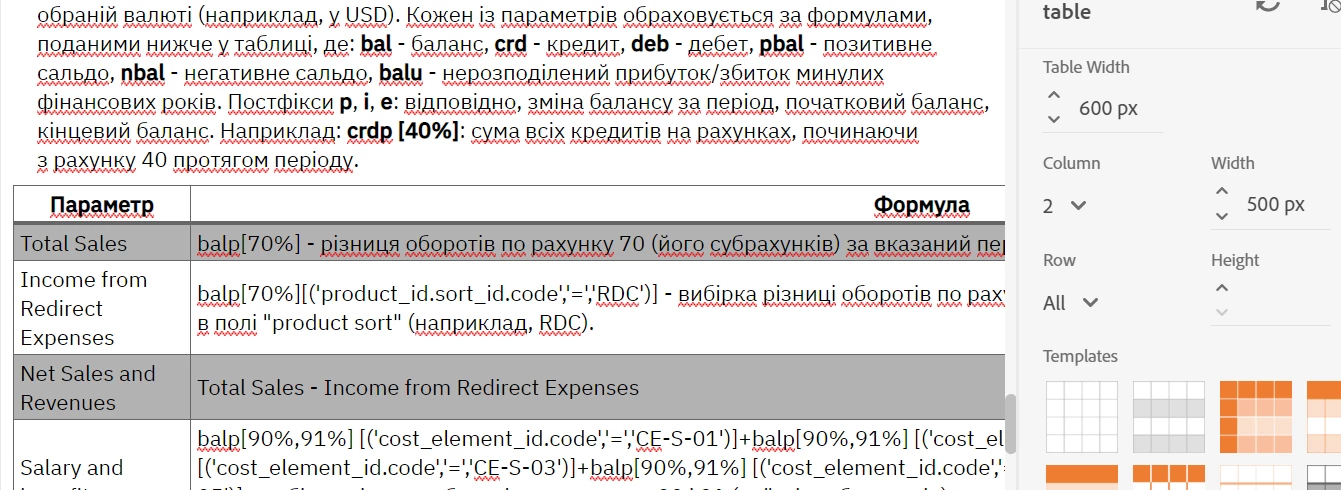 The table is 600 px width, the second column is 500 px width. Every width is specified in the fields. And when the table is empty it is really 600 px width. But after I added some very long text in the cells, it expanded and went far beyond the page. The table does not respond to settings in the right panel. When you view this table in a browser, a scroll bar appears. When you view this table in PDF, the table is simply truncated to the right.