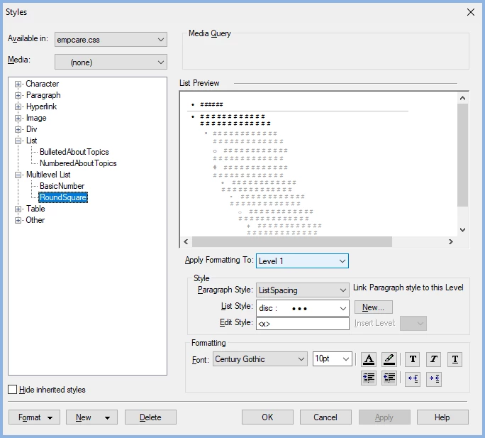 I created a multi-level bulleted list style for our project that goes round, square, circle, repeat. For some reason I don't understand, the Level 1 style bullet and text is noticeably smaller than Level 2, despite them being the same font size. It's also not the same size as the Level 4, which is the same bullet style repeated. Any ideas what could be causing this?