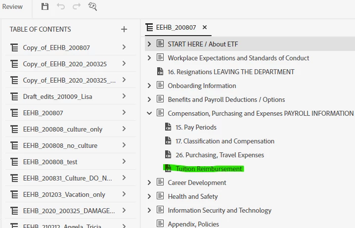 - Pasted it into the TOC; renamed it "Tuition Reimbursement" (green, Screenshot 2)