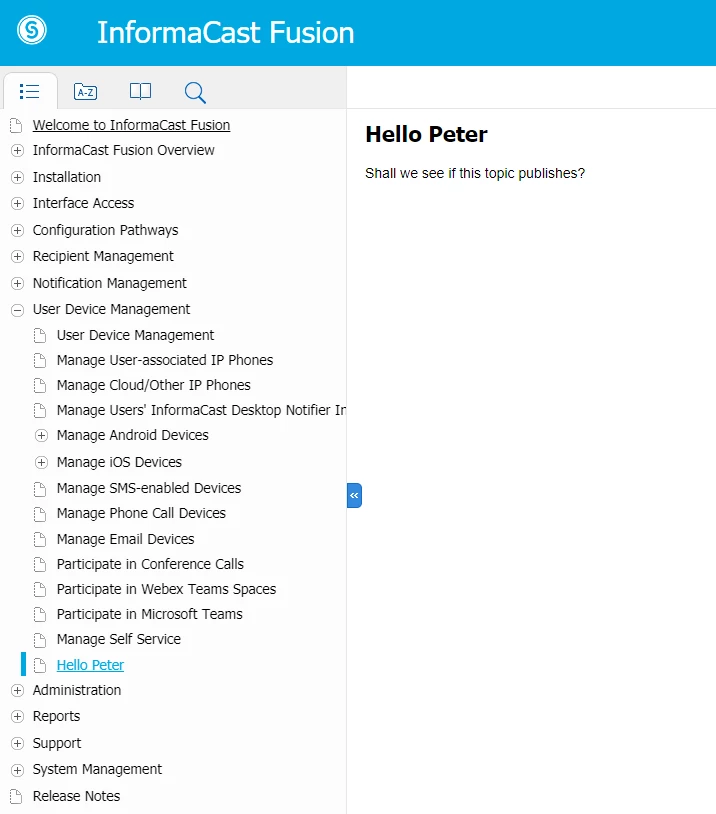 The topic appears correctly in the Output pane, and should look like this in both the Mobile and Fusion outputs: