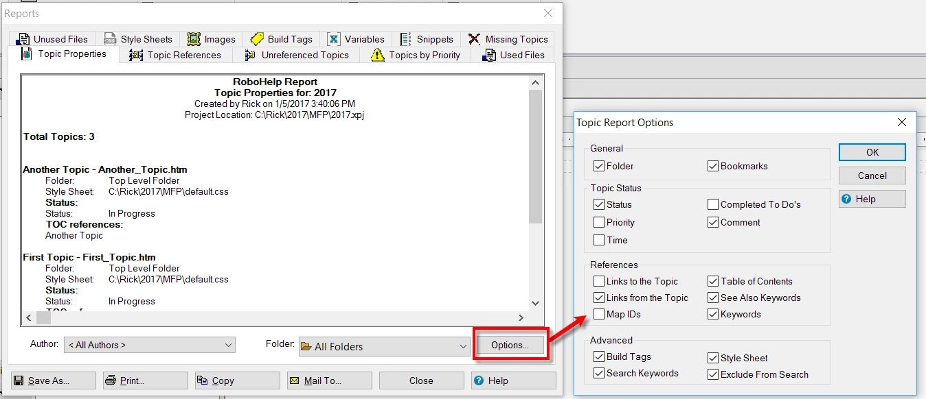 I was hoping there was an easy way to export the topic list inside RoboHelp - where it lets you filter by TOC, TOC Name, Status etc. This way I could blend the topic list with view count data from the Frequently Viewed Topic report (provided in RoboServer admin console). However, I have not figured out how to pull a list of all topics - in particular all topics used in a specific TOC.