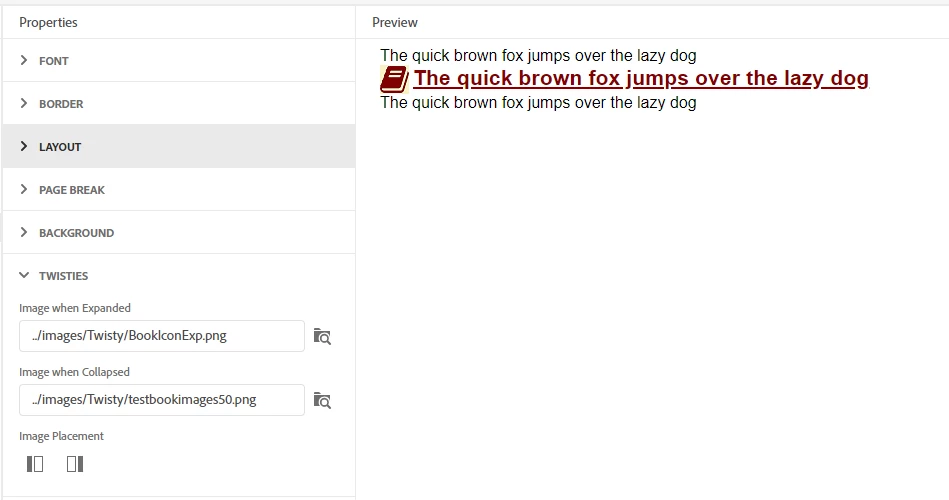 Additionally, when I click either Image Placement icon (to place the twisty image to the left of the drop down title or the right of the drop down title) the file paths to the twisty images disappear.