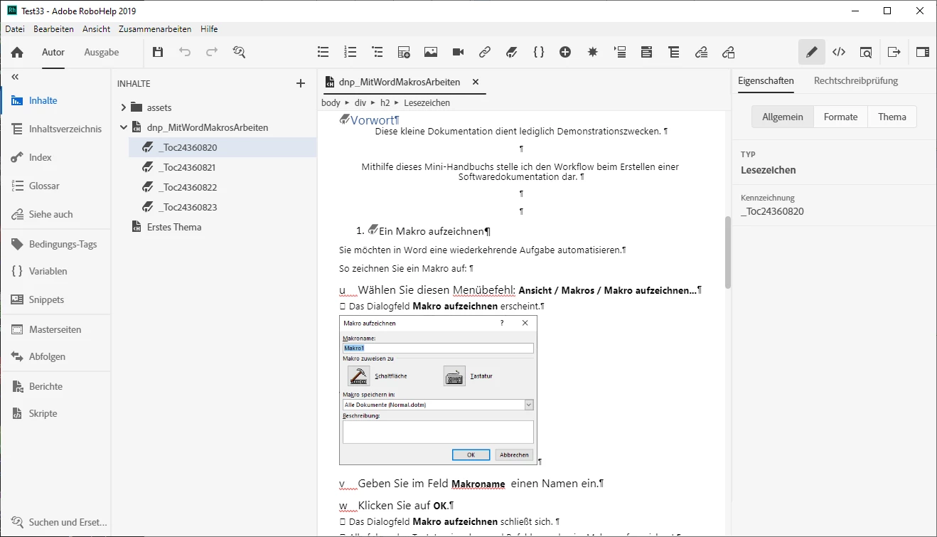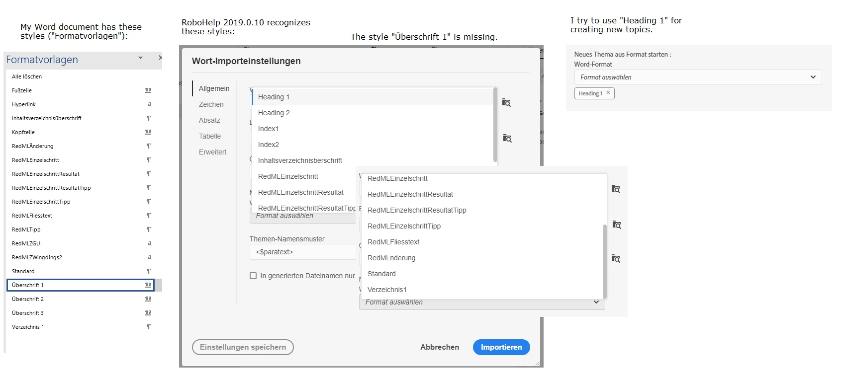 I'm using RoboHelp 2019.0.10 (with the new GUI) in German. I try to import a Word document. New topics shall be created when text in the Word document is formatted with the style "Überschrift 1", which means "Heading 1". When importing the Word document, RoboHelp does not recognize "Überschrift 1" but only "Heading 1". Compare the image WordImportProblem.png. I select the option "Neues Thema aus Format starten" (means: Start new topic with style) and select "Heading 1".