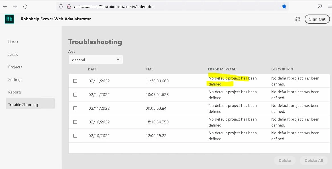 I have this message on my RH11 server after the publication : No default project has been defined