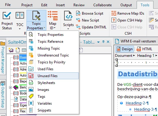 I'm trying to find the Unused Files report in RoboHelp 2015 (12.0.1.338). The help advises to select Tools > Project Status > Unused Files. It seems the only report I can view is Project Status. All the reports available in previous versions of RoboHelp seem to have disappeared.