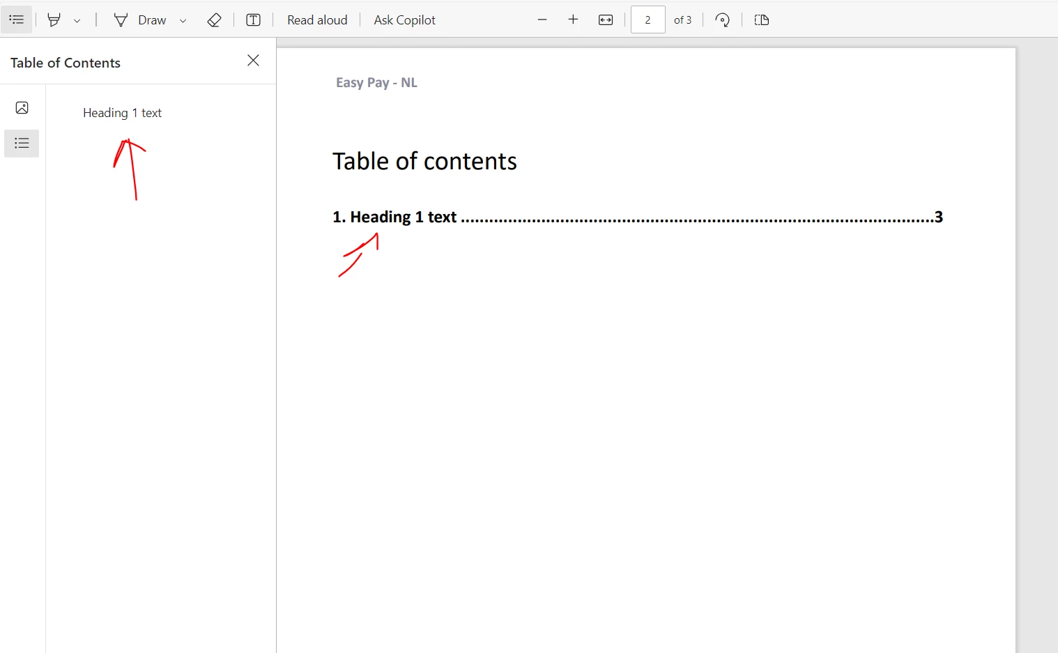 Generating a PDF output, however, results in the H1 (2) being displayed in the TOC: