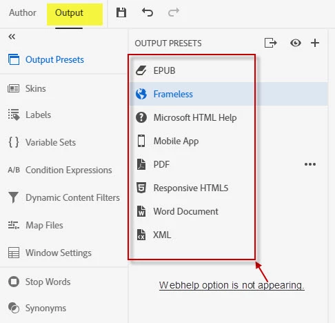 On the Output tab, Webhelp option is not appearing.