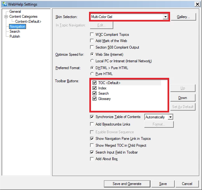 I'm not aware of any Print switch anywhere else - the only place I know to go is Webhelp Settings>Navigation. Print displays in the Toolbar Buttons box, and you click to select it. Is there something else that controls this? The skin I show in the image is NOT the basic skin I used, but it doesn't display Print either. Thank you!