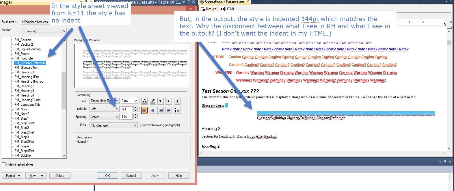 For example, my GlossaryDefinition style (FM_GlossaryDefinition) is indented in FM (it is part of a run-in head construction) and I don't want this in the output HTML. But, the CSS as displayed in RH shows no indent while the HTML displays an indent. How can this be? what is going on?