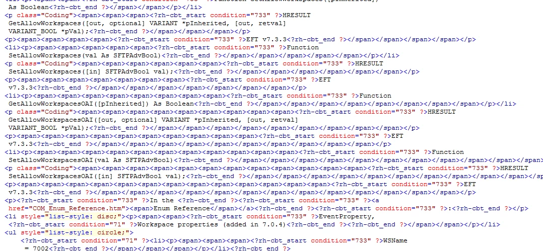 Anyway, there are some 1000 emtpy <span> tags in 18 topics that don't have any attributes in them. I've checked the revision history for one of our files, and it appears that this started happening sometime after the upgrade to RH 9. The initial conversion to RH 9 didn't increase the # of <span> tags, but subsequent edits and saves to the file I checked seems to be causing it.