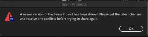 I am unable to share my changes since Premiere detects new changes from my team member. However, I am not able to get the latest version of the team project since the "Get Latest Changes" button is disabled.