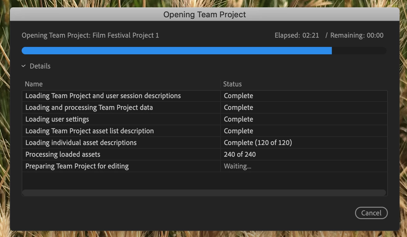 After updating Premiere, now the team project loading window (in the picture) has stayed up rather than disappear. But the project still doesn't load, and it's been loading for half an hour as of me writing this. As can be seen in the screenshot given, all components of the Team Project have successfully loaded except for the one labeled Preparing Team Project for Editing, which is still "Waiting..."