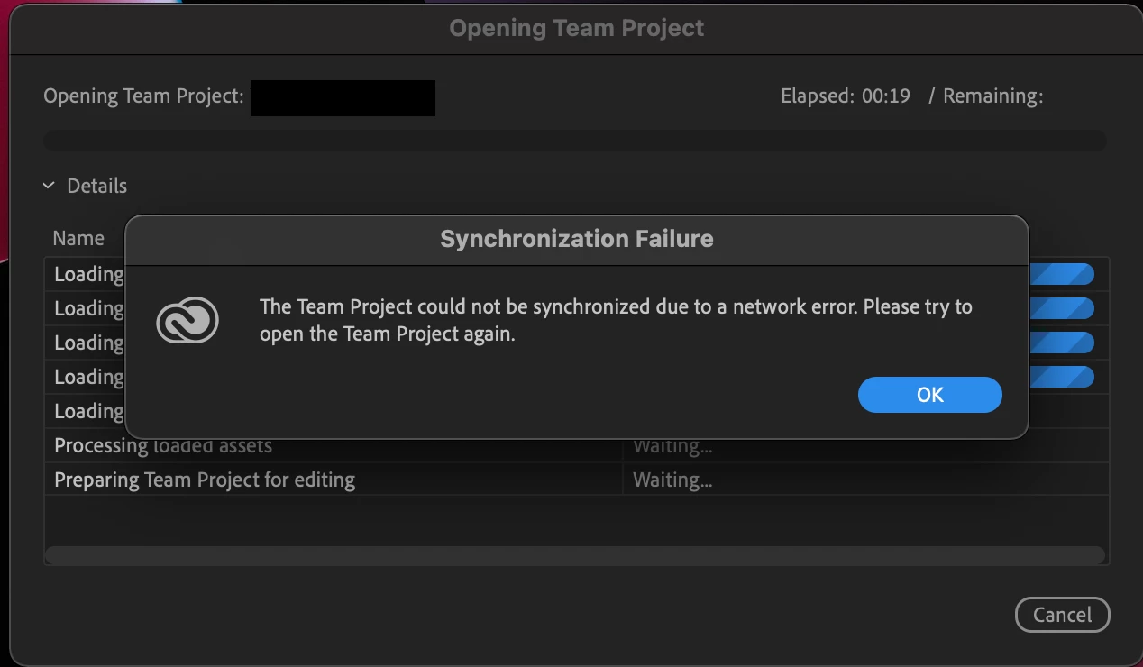 "The Team Project could not be synchronized due to a network error. Please try to open the Team Project again."