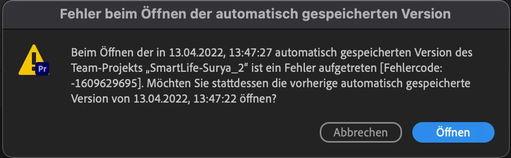 I was working on a team project yesterday and this morning I wanted to continue working, but each time the same error message comes up with the code "Error code:-1609629695". I could not find anything on the website regarding such an error code.