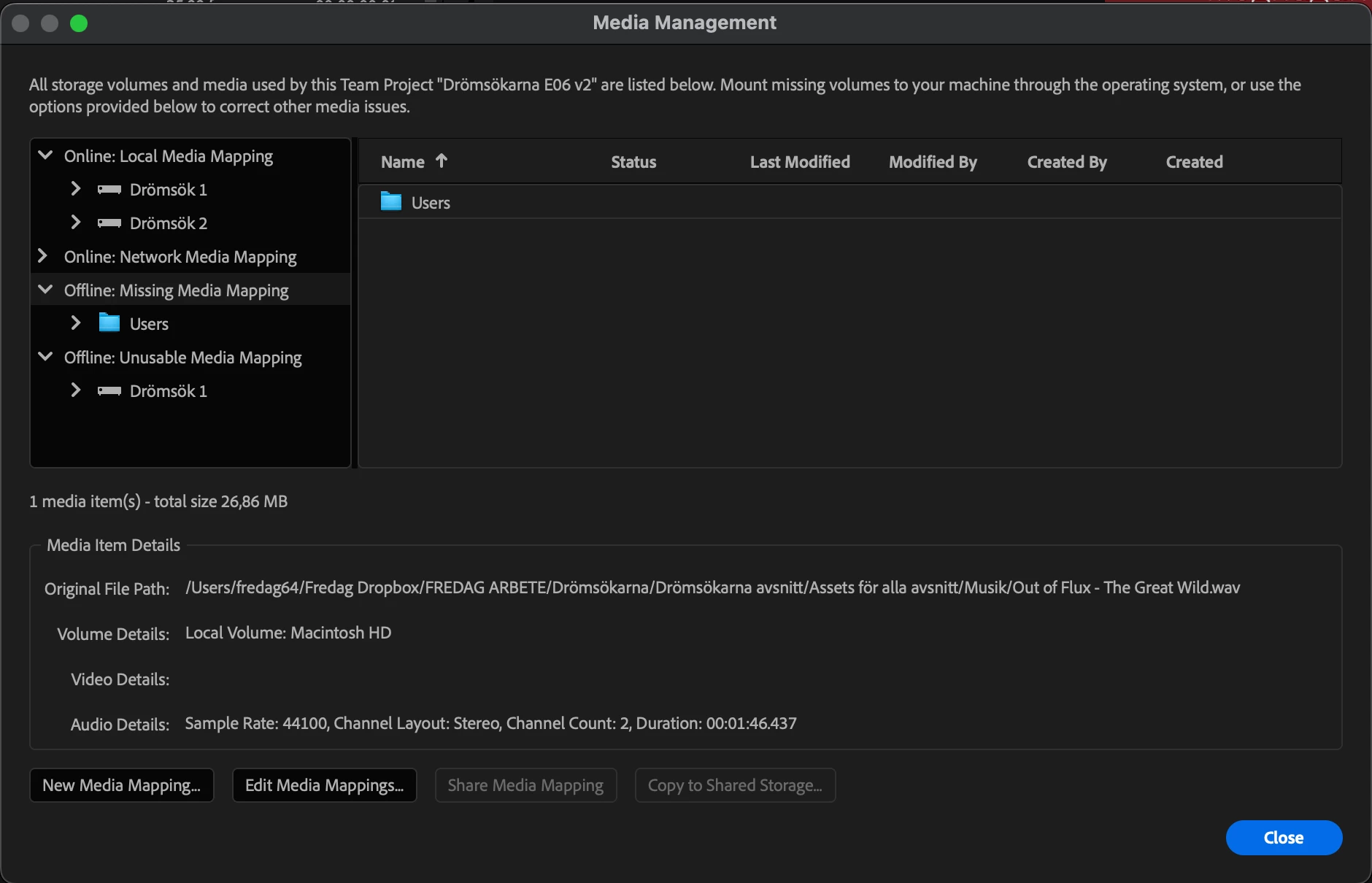 Hi, I have a problem with a team project where I try to relink offline media but premiere are not remembering the old path. We've been two people working on this project from two different locations and each of us has an external hard drive with all the footage. We've been working on around 15 different projects at the same time with the same set up and it has worked fine for the most part but this project doesn't seem to work for any of us without going in and trying to find the files manually and relink it. I've tried to open a couple of auto saves but still have the same issue, I've also tried to convert it to a local project but that hasn't helped either. Does anyone know how to fix this?