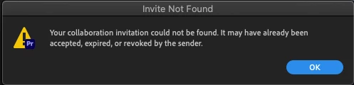Everytime my coworker and I share a team project, it shows up in the window for invites, but when I click on it, it says "Your collaboration invitation could not be found. It may have already been accepted, expired, or revoked by the sender" - Unless it's expiring right away, it keeps glitching. We can access past projects we've collaborated on, we just can't make any new team projects in Premiere Pro. It's not our work firewalls because I tried the same thing on my personal computer and got the same error.