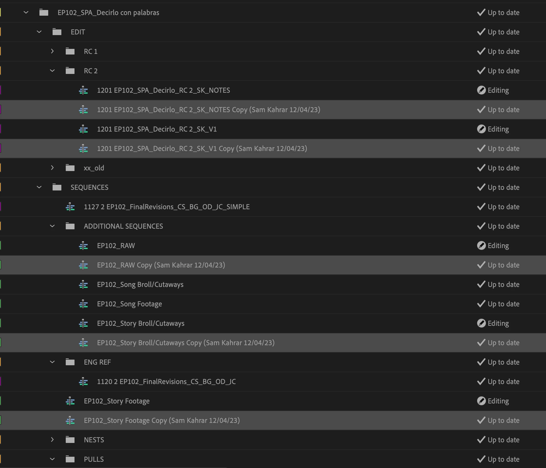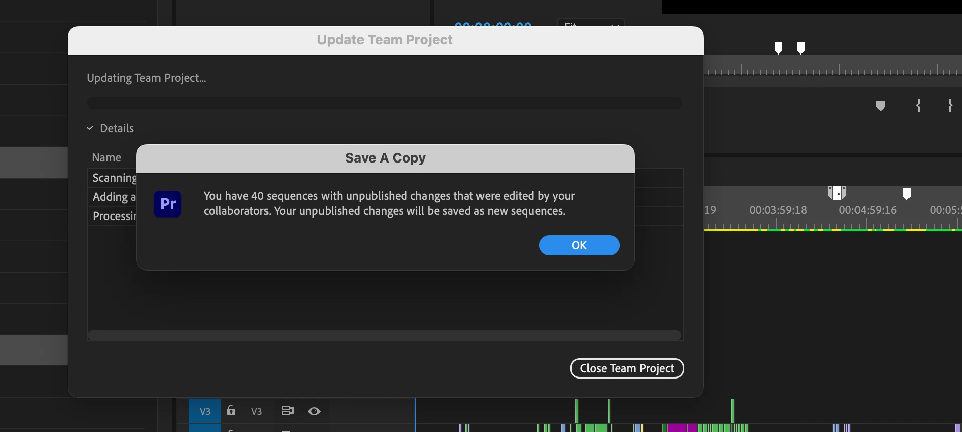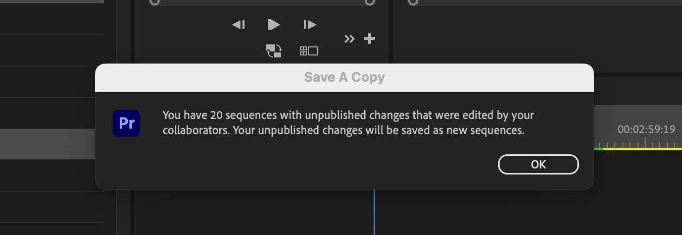 I have now been having the problem, however, where the project seems to think there are unpublished changes, and keep duplicating sequences to try and save the progress. I'm wondering if this was a glitch that kept repeating because we don't publish the sequences we never asked for? Or if we're not updating or publishing enough, so the system is incorrectly assuming it needs to go into recover mode? Every user has had the same problem on their end. I'm attaching screen grabs for reference.