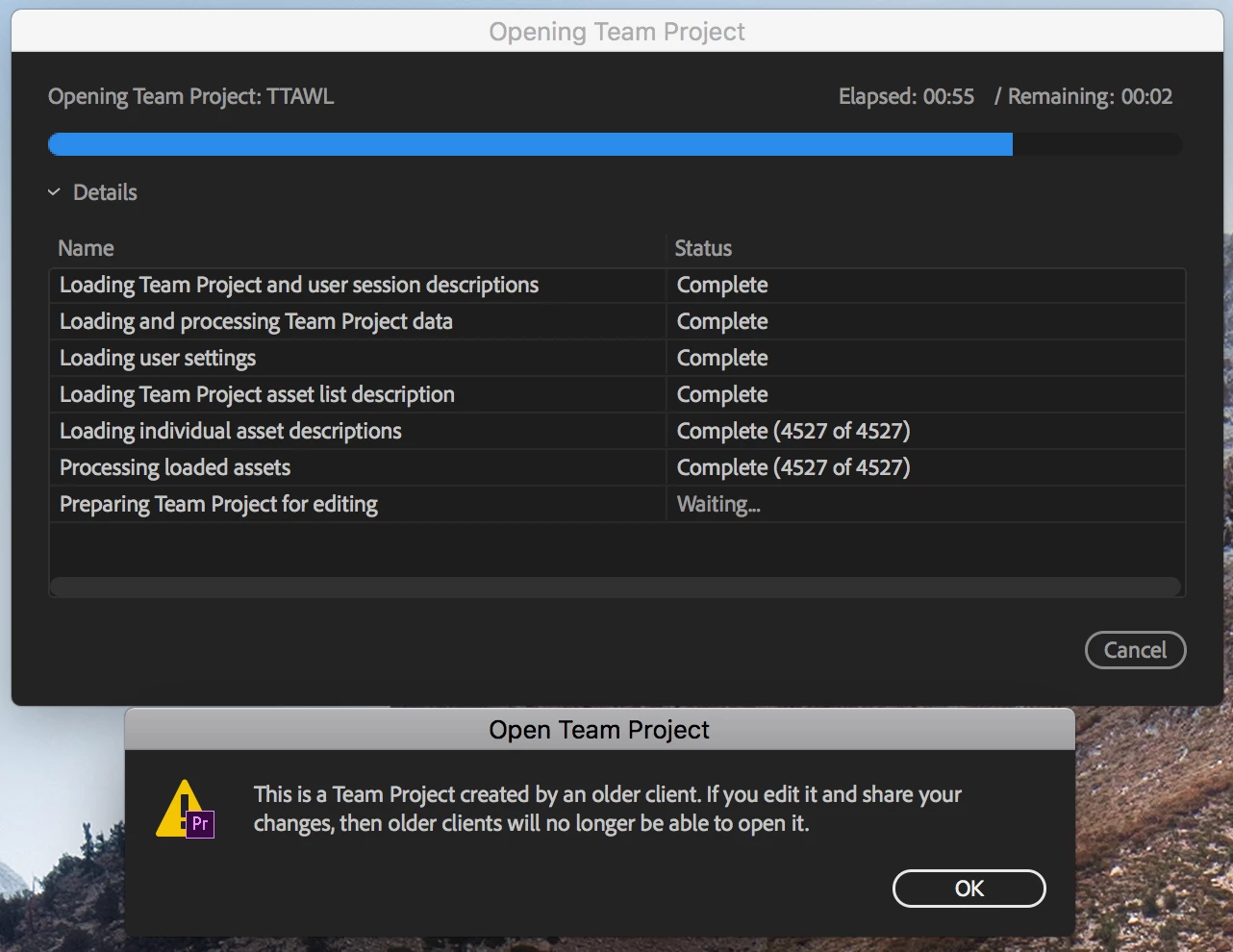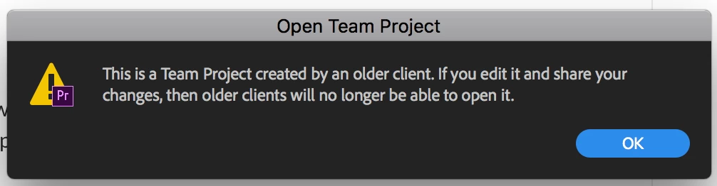 The crashing is separate from the message about the older client. That's a warning saying other people on your team are using an older version of Premiere. As soon as you push edits to the cloud those team members won't be able to open the Team Project. It sounds like your coworkers need to upgrade from 12.0 to 12.1.