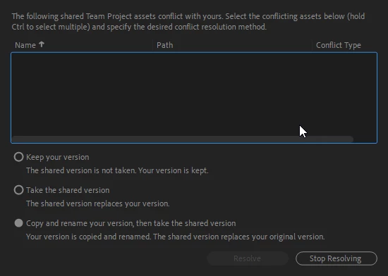 Premiere Pro Team Project - Resolve Conflicts (empty window)
