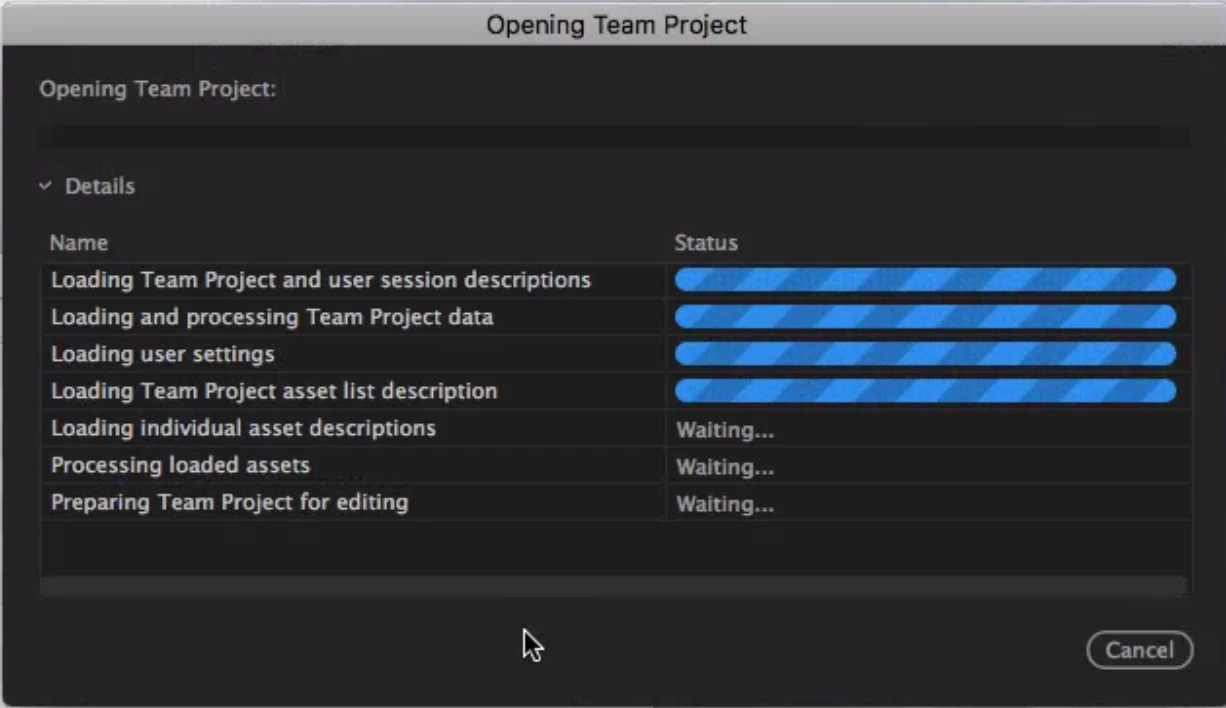 Hi, I'm using Premiere Pro CC 2017.1.2. I'm trying to open a buns of team projects I own and it gets stuck. It doesn't get past this point, it tries to open for a minute, and then it gives up. Any idea what's going on?