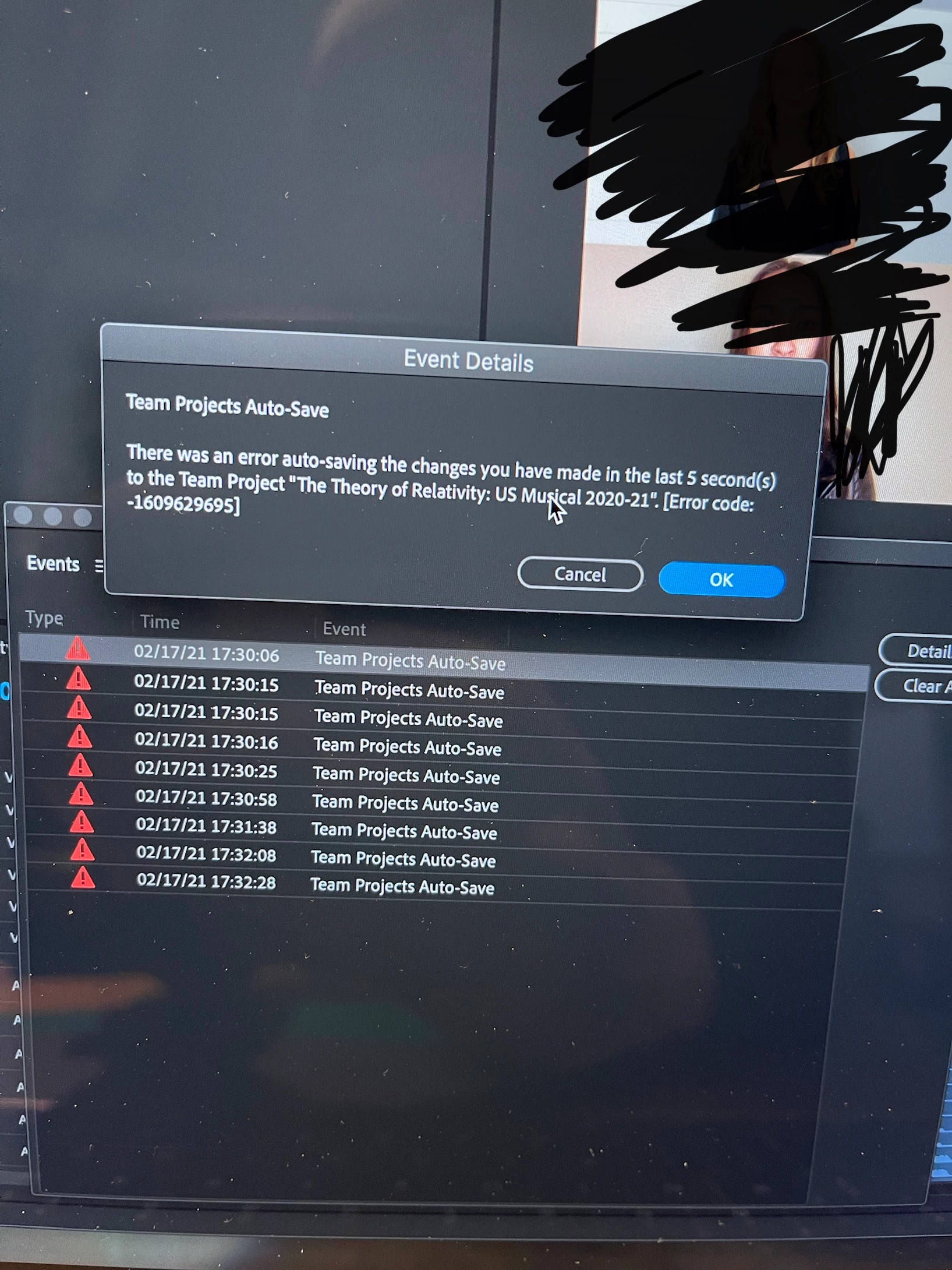 Hi all! I'm working on a team project with three editors all working on different pieces of footage in different sequences at the same time. On two of the computers (MacBook Pros with specs below), I receive the below error pretty often (every 20 mins or so). I’ve tried closing Premiere, deleting the team project folders from the Common folder of Library and that solves it for a little while and lets me open the project without any errors until the whole thing happened again ~15 mins later. Any suggestions are much appreciated!