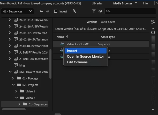 Could someone explain what the 'import' button in the Media Browser when viewing old versions of Team Projects is meant to do?