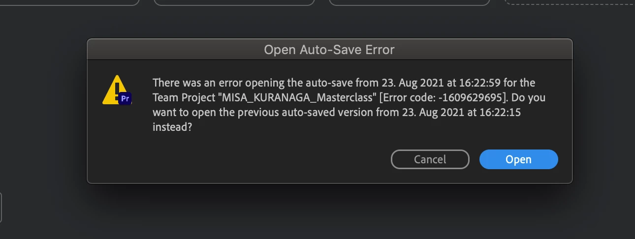 Hi, I am a collaborator in a Team Project and I am having problems opening the team project I was working in. When I try to open it again it keeps saying "There is an error opening the auto-save from (time), Do you want to open the previous auto saved version from (time) instead?" The options are "Cancel" or "Open". I click "Open" and it says it again with the previous version and like this millions of times. I tried opening it in another computer and it worked, but I need to work in the original computer (mine). Why is that and how can I fix it? I already tried searching for the autosave files, disconnecting internet, rebooting the router and the computer. The thing is that I didn't share the last changes so I am guessing no one else have my changes, so is not a solution to ask for another person to load the changes.