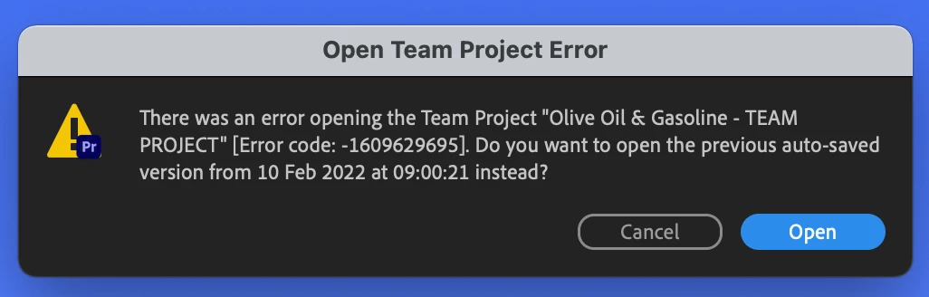 I've been working with a remote client now for a few weeks using Team Projects. However, in the past 2 days I've been getting this errror message (attached below) when I try to open it. I click on 'Open' to go to a previous version autosave and get the same message. I get stuck in this loop for hours and eventually it just seems to give up.