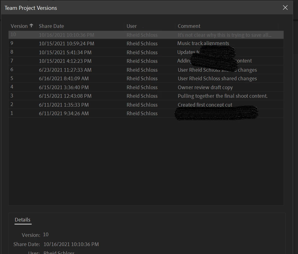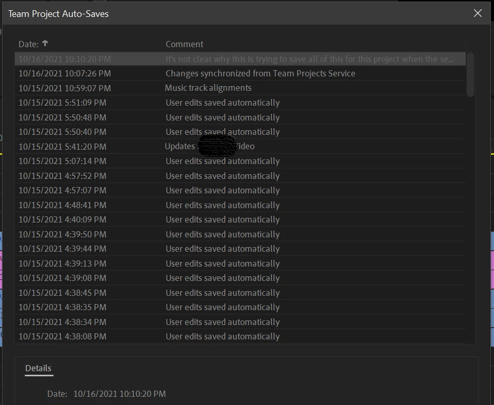 I have a team project that I copied a segment from another project into. It's a segment that we use as a template for a video series. The copy brings with it the assets for the series which are on a creative cloud share to which we usually replace sections of the segment with the new content from the project. After this copy I push the team project updates and proceed to work on it normally. My auto save setting seem to be working normally and I randomly keep pushing shared team updates. After a 4 hour or longer editing session, I push my changes and exit the project. When I come back to the project, the last saved version of the segment has the time stamp when I ended the editing; however, none of the edits I made in those four plus hours of editing are there. When looking at the version history, those random puhses don't appear and when looking at the auto save history, there is nothing there during the time frame of editing in that editing window; however, the autosave history is there before it. It is really strange. No system hangs or performance issues.