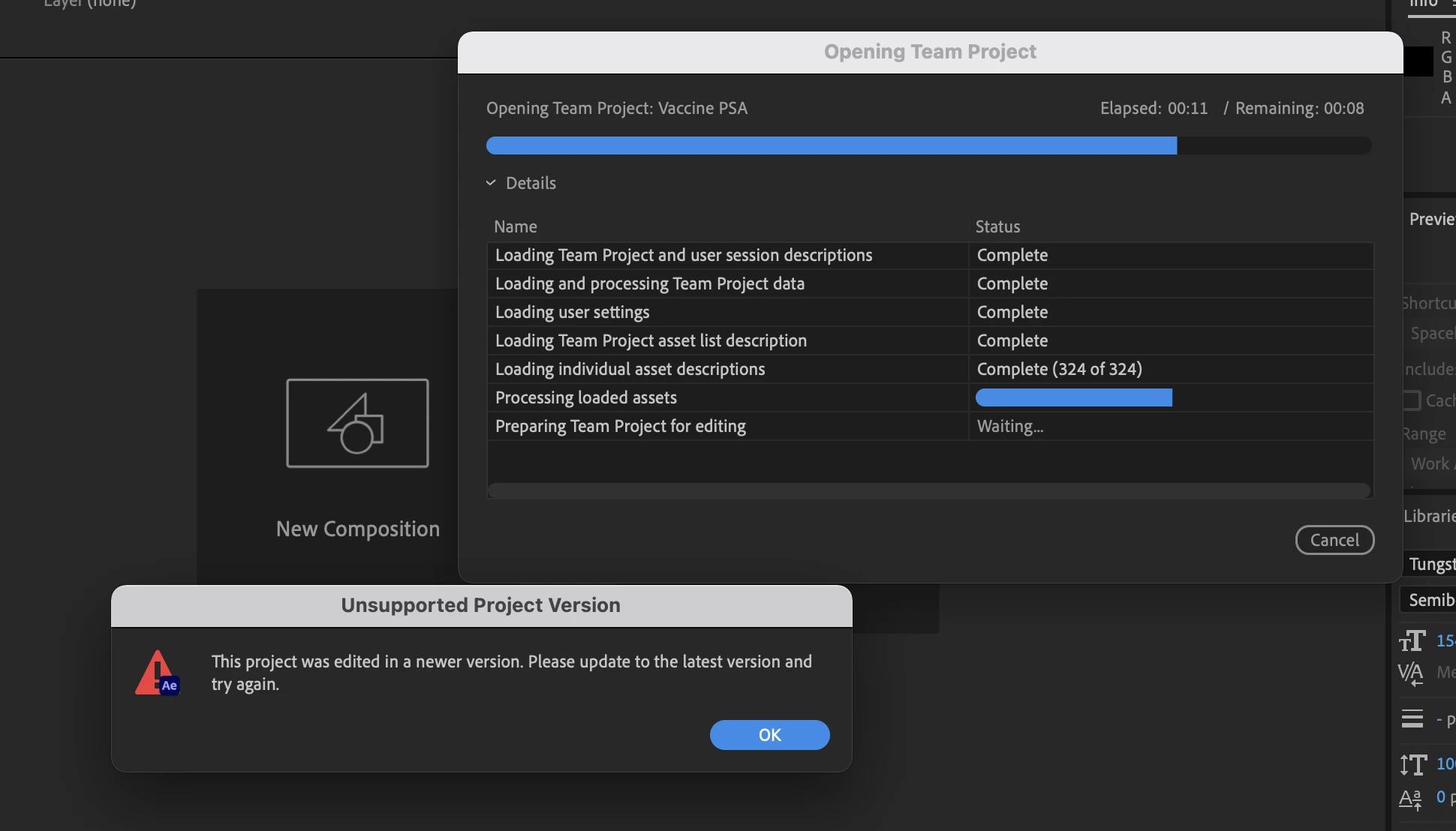 "Unsupported Project Version" unresolvable After Effect warning