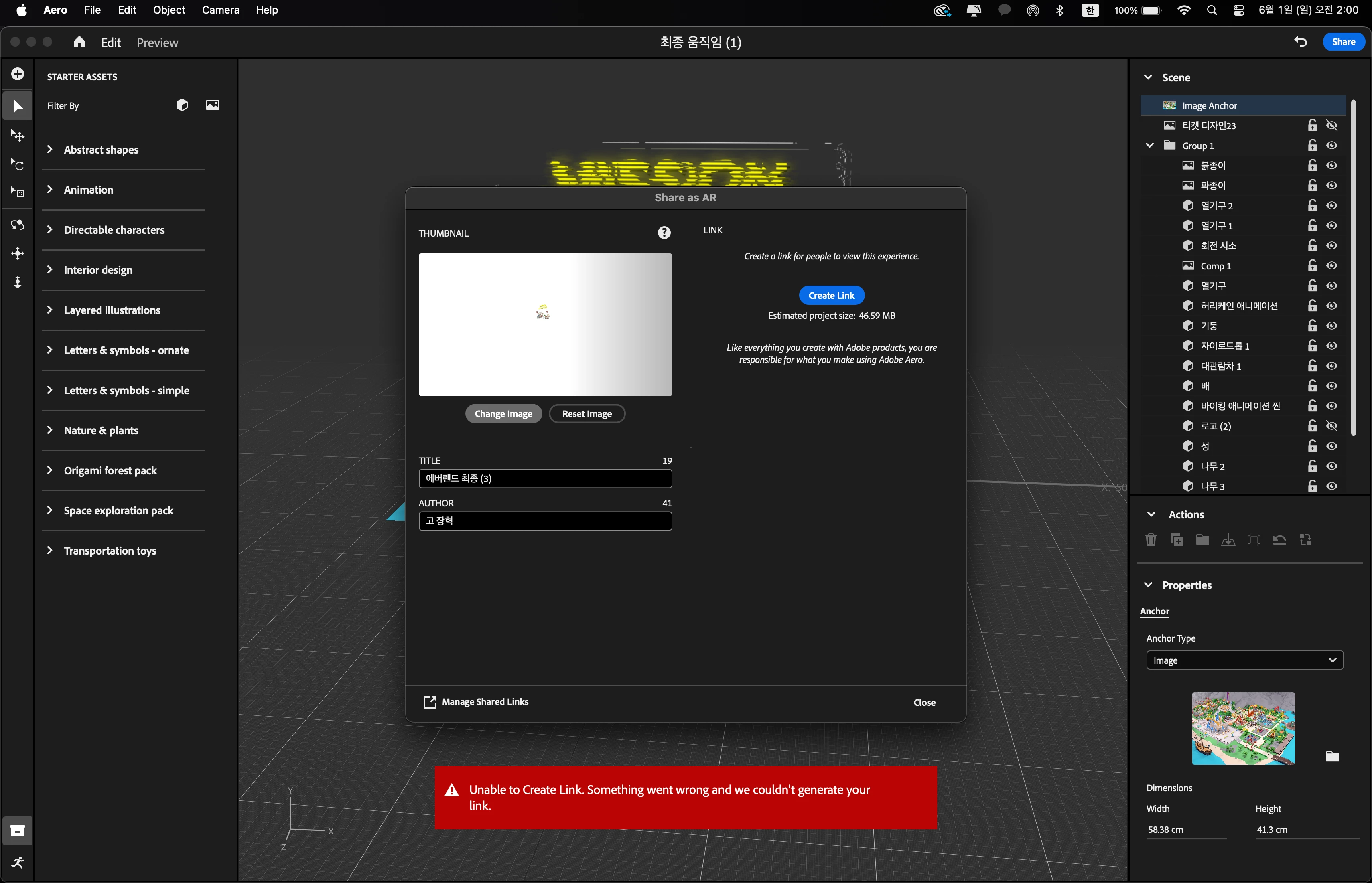 Adobe Aero에서 링크 생성이 작동하지 않습니다.