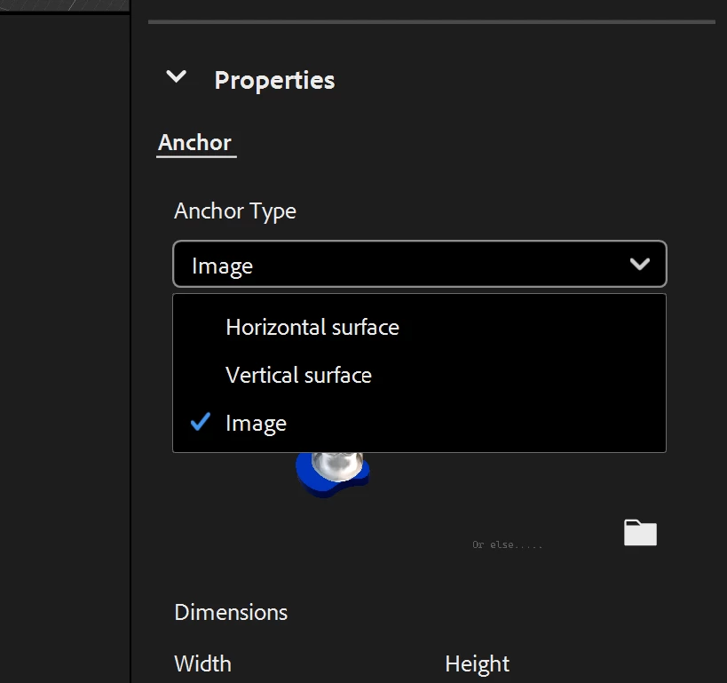 2. I saw a lot of youtube videos, and for a design which has image tracking all those youtube people could select image + vertical/horizontal surface for anchor type (refer to image 2). But in my laptop ( Lenovo yoga windows ) the adobe aero app shows me that I can only select one of the three options in anchor type. (refer to image 3)
