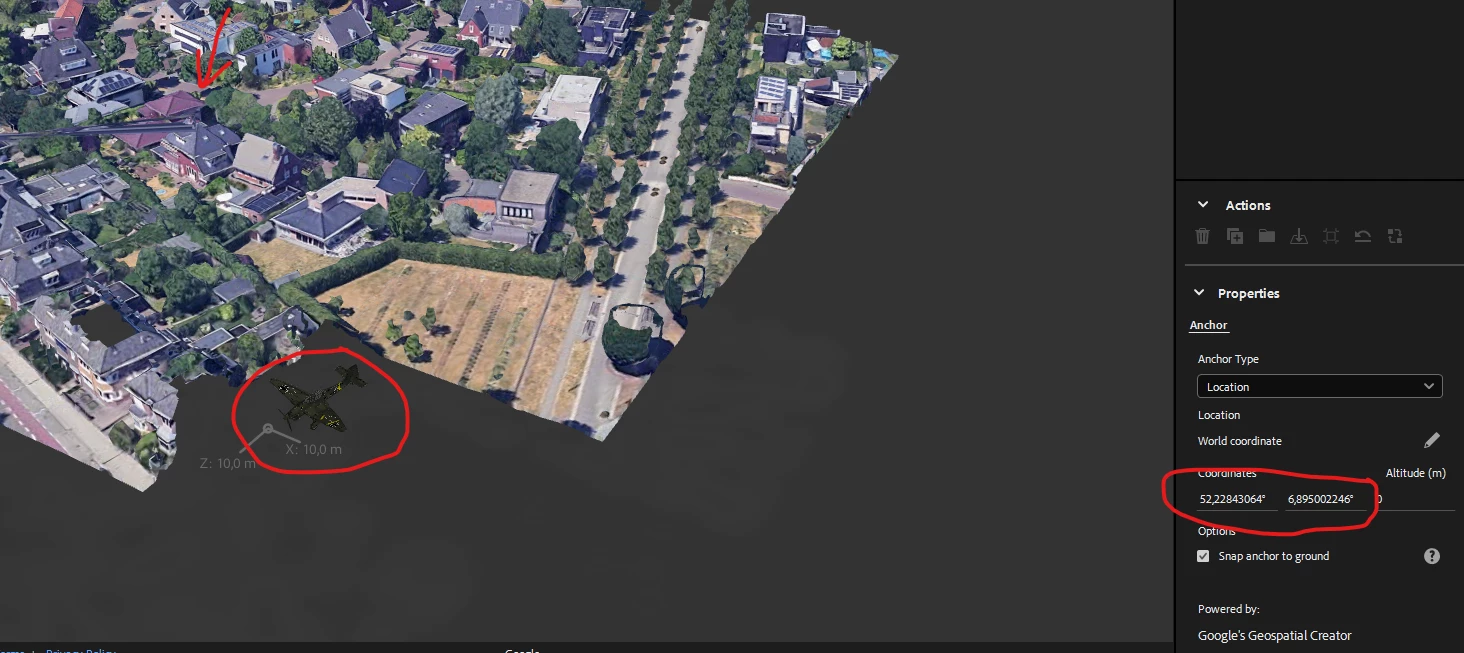 As a way of 'learning by doing' I am trying to 'land' this model of an WWII aeroplane onto the entrance drive to my home. I added the location manually into the coordinates on the right side of the Aero screen. And I sat the 'snapped to the ground' check mark. (see attach) But: