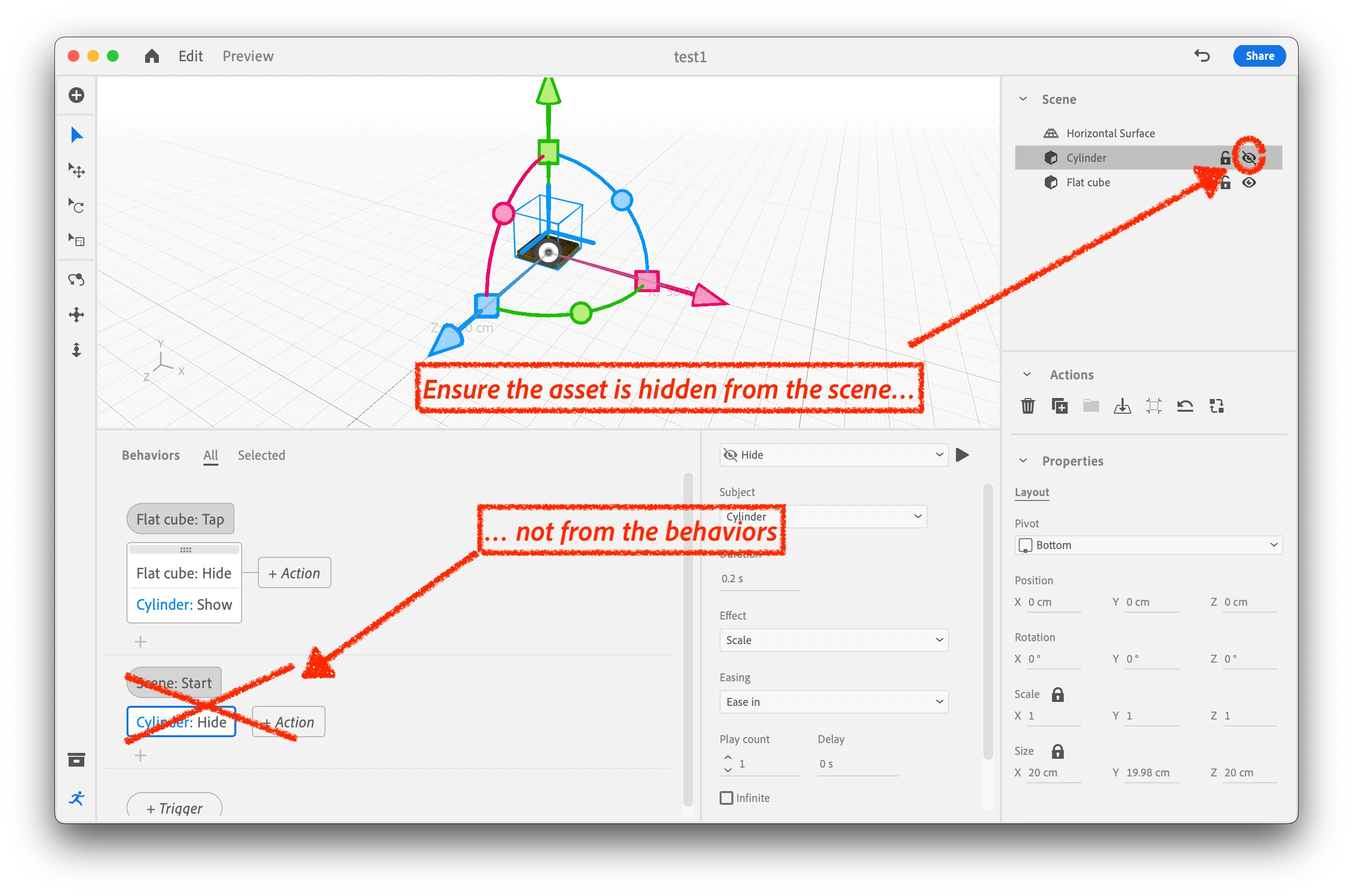 I've created an AR experience that has the user tap on a red X to reveal a hidden treasure chest. The effect is spoiled when the user is prompted to choose a surface anchor, it already shows the treasure chest, even though it's set to hide.