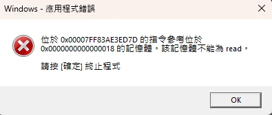 “0X????????”指令引用的“0x00000000”記憶體,該記憶體不能為“read”或“written”