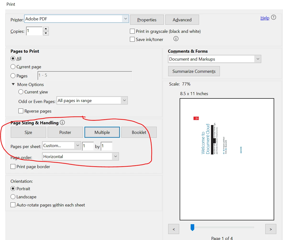 - Open file>Print> select Adobe PDF as printer> change the Page size and handling to Multiple with 1by1>Print and Save the file with the new name.