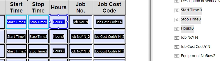 -Each Job line of the sheet has Start time, Stop time, and Hours total ("Start Time.0" , "Stop Time0", "Hours.0" specifically, field ranges of ____.0 to ____.13 see attached image). Example: Start - 0600, Stop - 1030, Hours - 4.5 // or // 0930 to 1430 = 5.0.