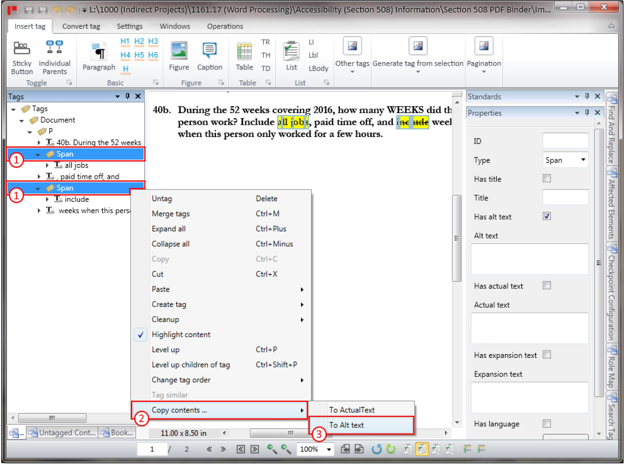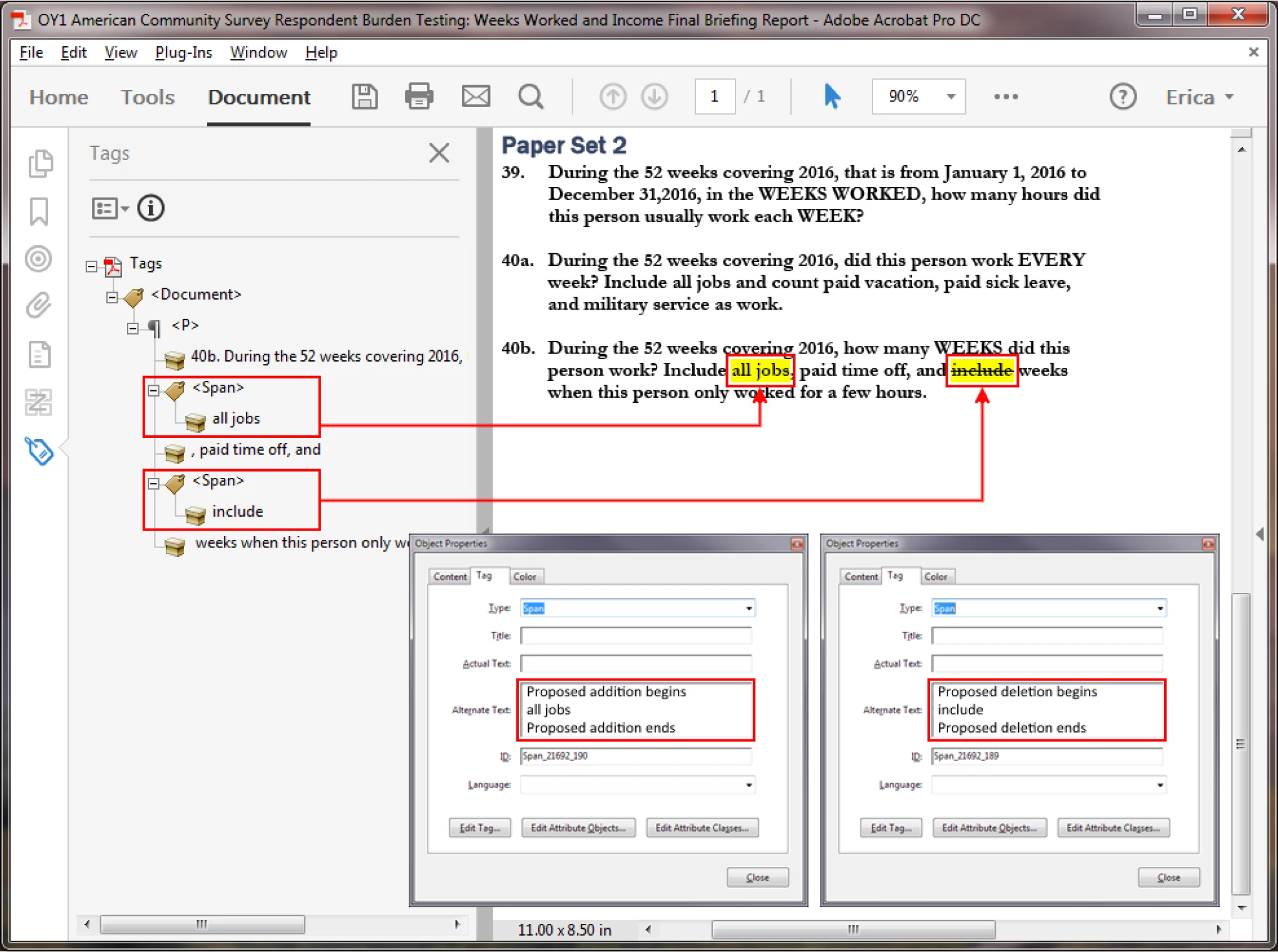 Is it possible to tag the content of a pdf converted from a word document, that shows track changes in the pdf, so that screen reader users can be notified that the chunk of text has a strike through/has been deleted and that a chunk of text is a different color and was inserted?