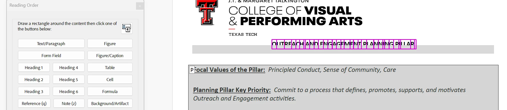 When trying to add H2 tag to document, Acrobat has added some kind of overlay. I have moved the text above the overlay to show it is still there. I cannot delete the overlay and the text is unable to be tagged. There is no undo, so I cannot try again without starting the tagging process from the beginning. Anyone know what is going on?