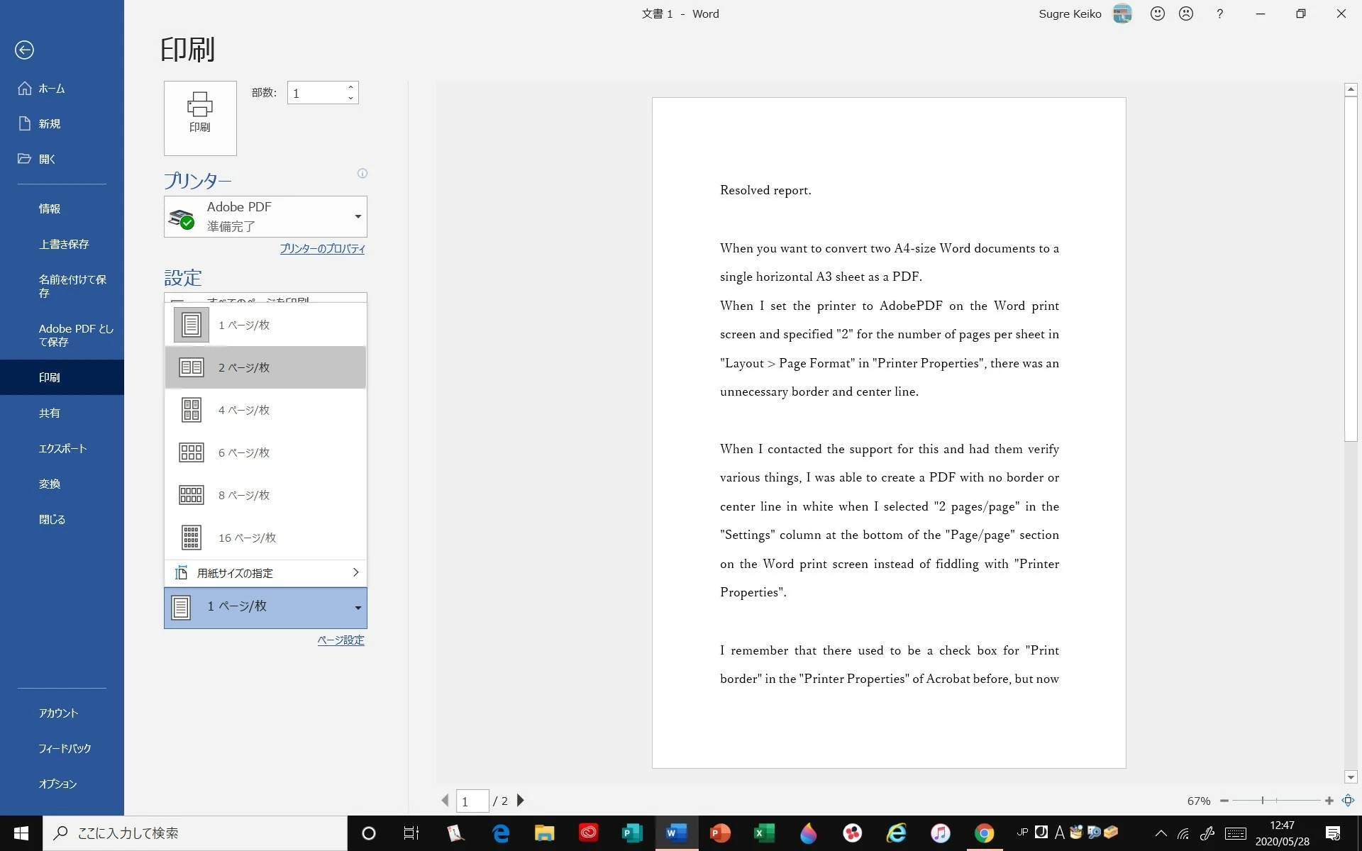 これをサポートに連絡し、いろいろ検証いただいたところ、「プリンターのプロパティ」をいじるのではなく、Word印刷画面で「設定」欄一番下の「●ページ/枚」というところで「2ページ/枚」を選択すると、枠線や中央線のない白い状態でPDF化することができました。