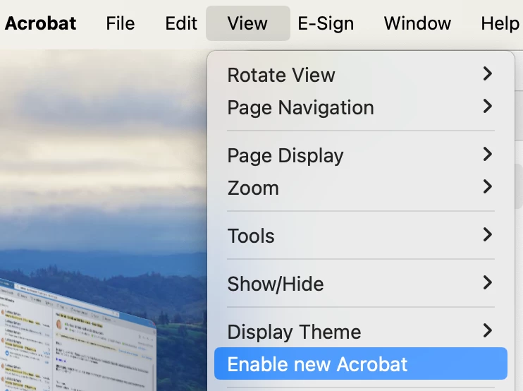 - From the View menu at the top, select Disable New Acrobat.