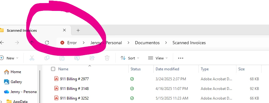 I cannot access any of my files that I have saved under Adobe. I have this at the top of my folder . If I scroll over the word ERROR it shows me this : View cloud storage information. What is going on. I have never had this issue since I bought this in 3/2025