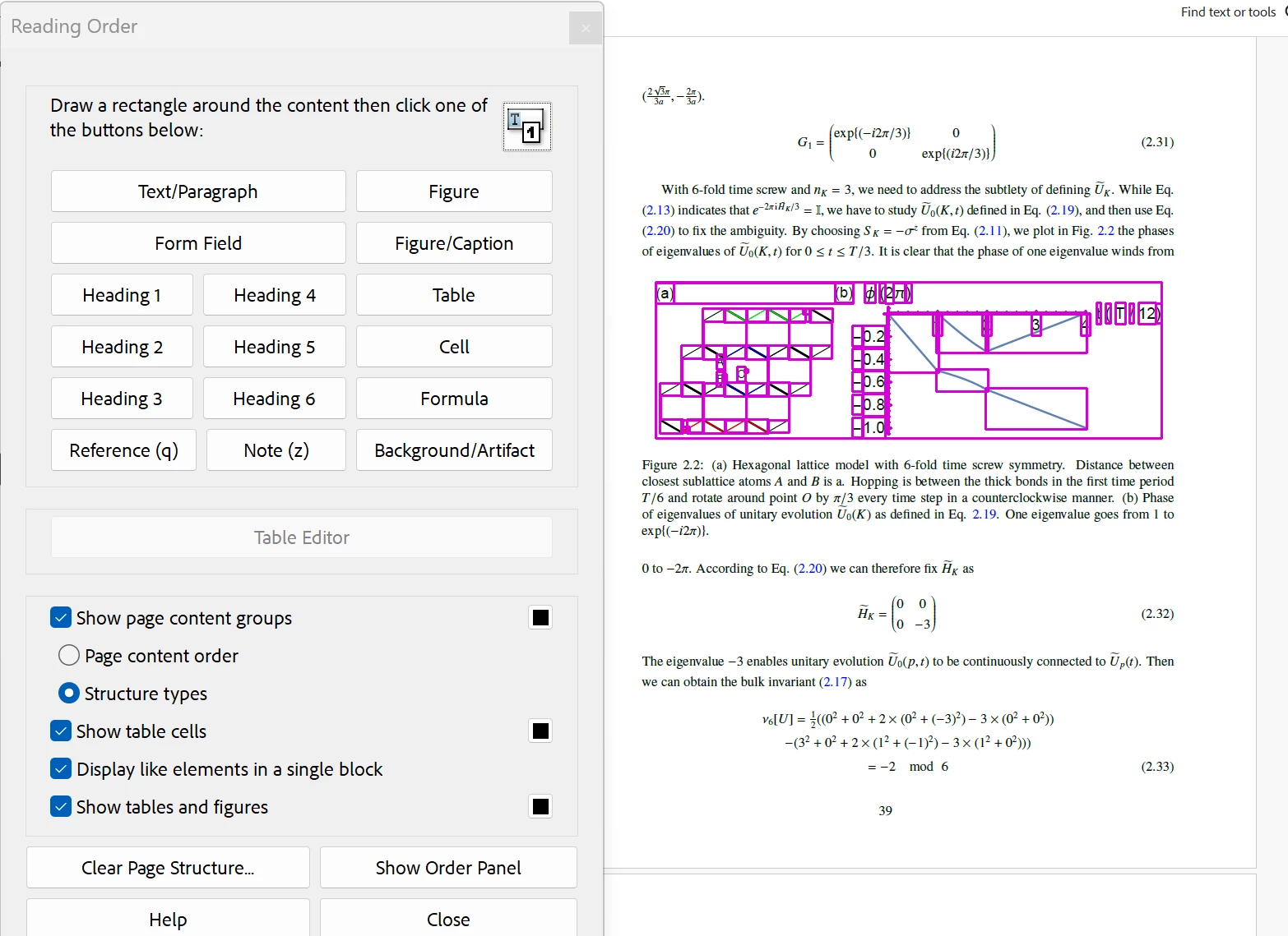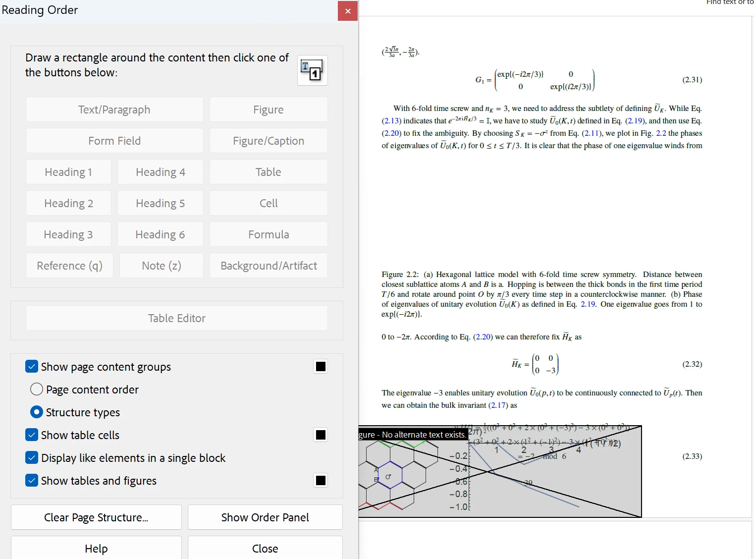 I encounter all kinds of problems using accessibility functions in adobe acrobat, maybe because the pdf is generated by latex. First, when I use automatically tag PDF, it adds lots of brackets on the formulas, as shown in the first picture. When I try to mannually label figures using the Fix reading order function, the position of the figure changed after I click figure, as shown in the difference between picture 2 and 3. What leads to these wired changes? How to solve that?